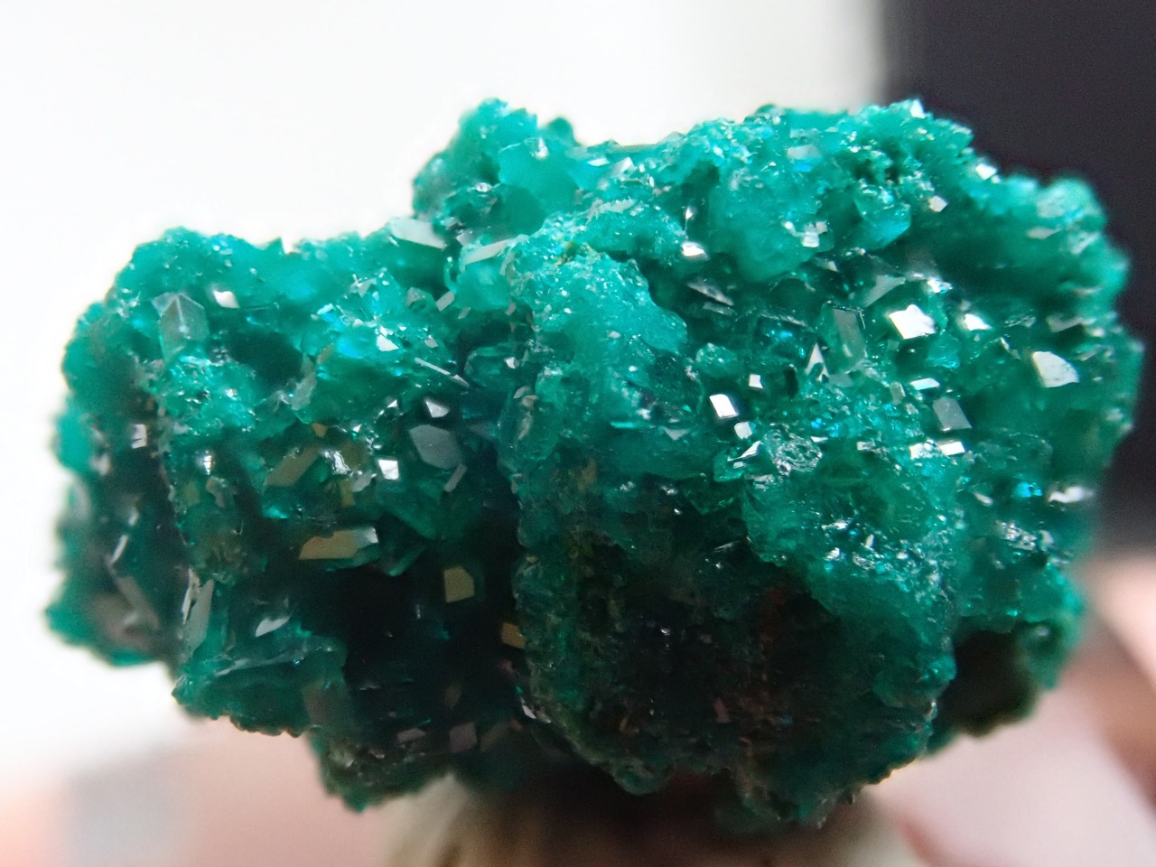 微細なダイオプテーズが無数に結晶し、クラスターになっています。まばゆい光沢があり、美しいです。