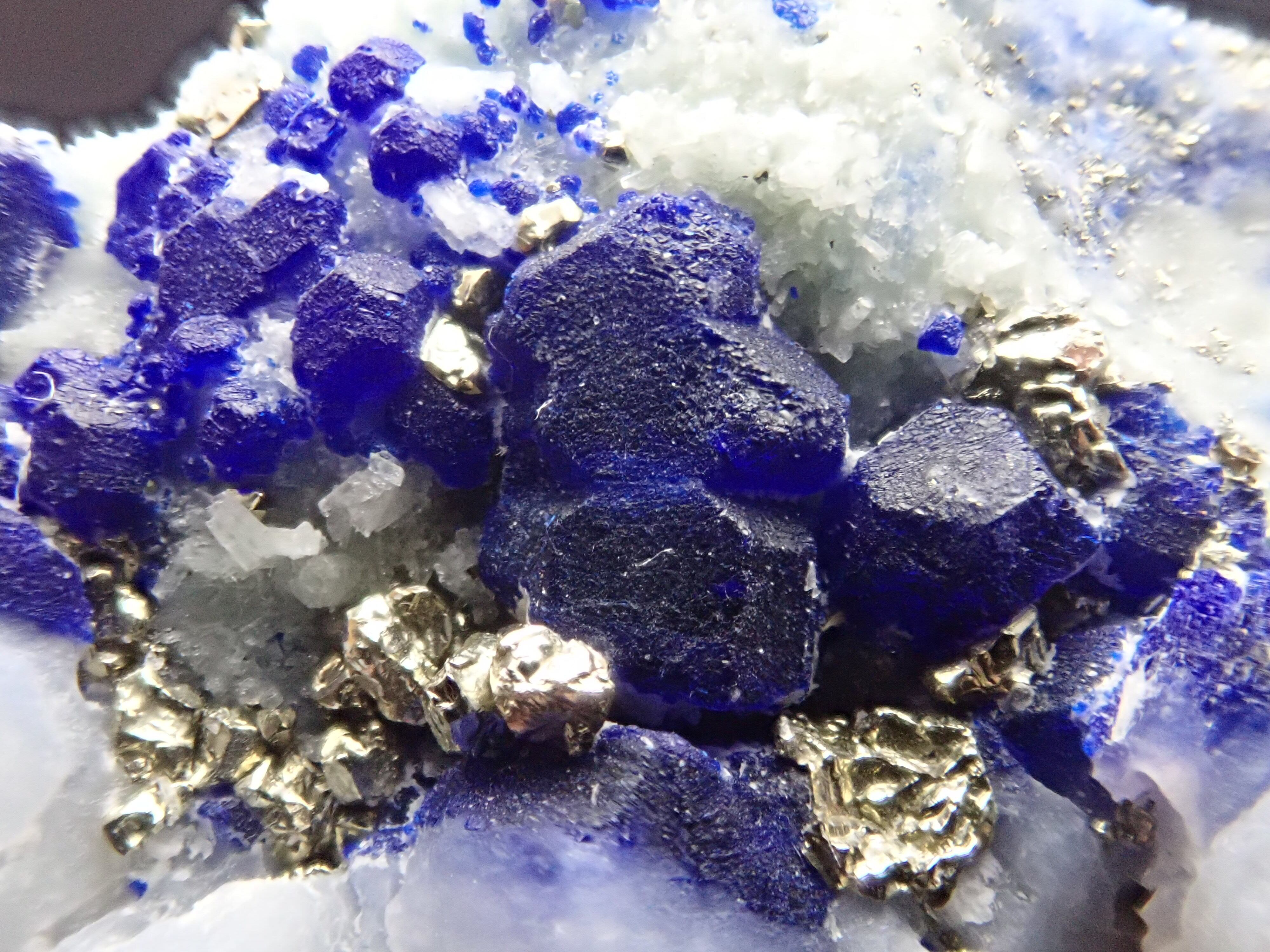 希少な結晶形を残した美しいラピスラズリの原石、ラズライトです。パイライトがたくさん散らばり光沢を放ち、石英は夜雲にみえ、まるで夜空です。
