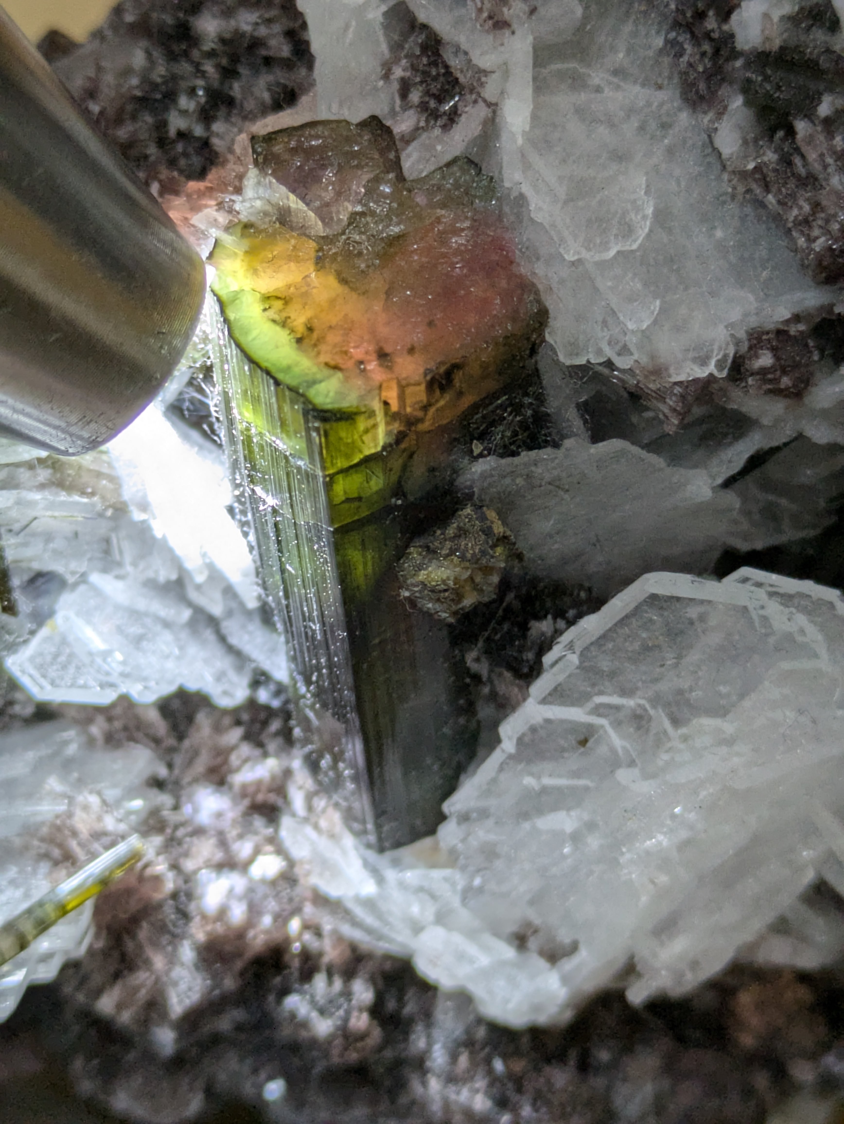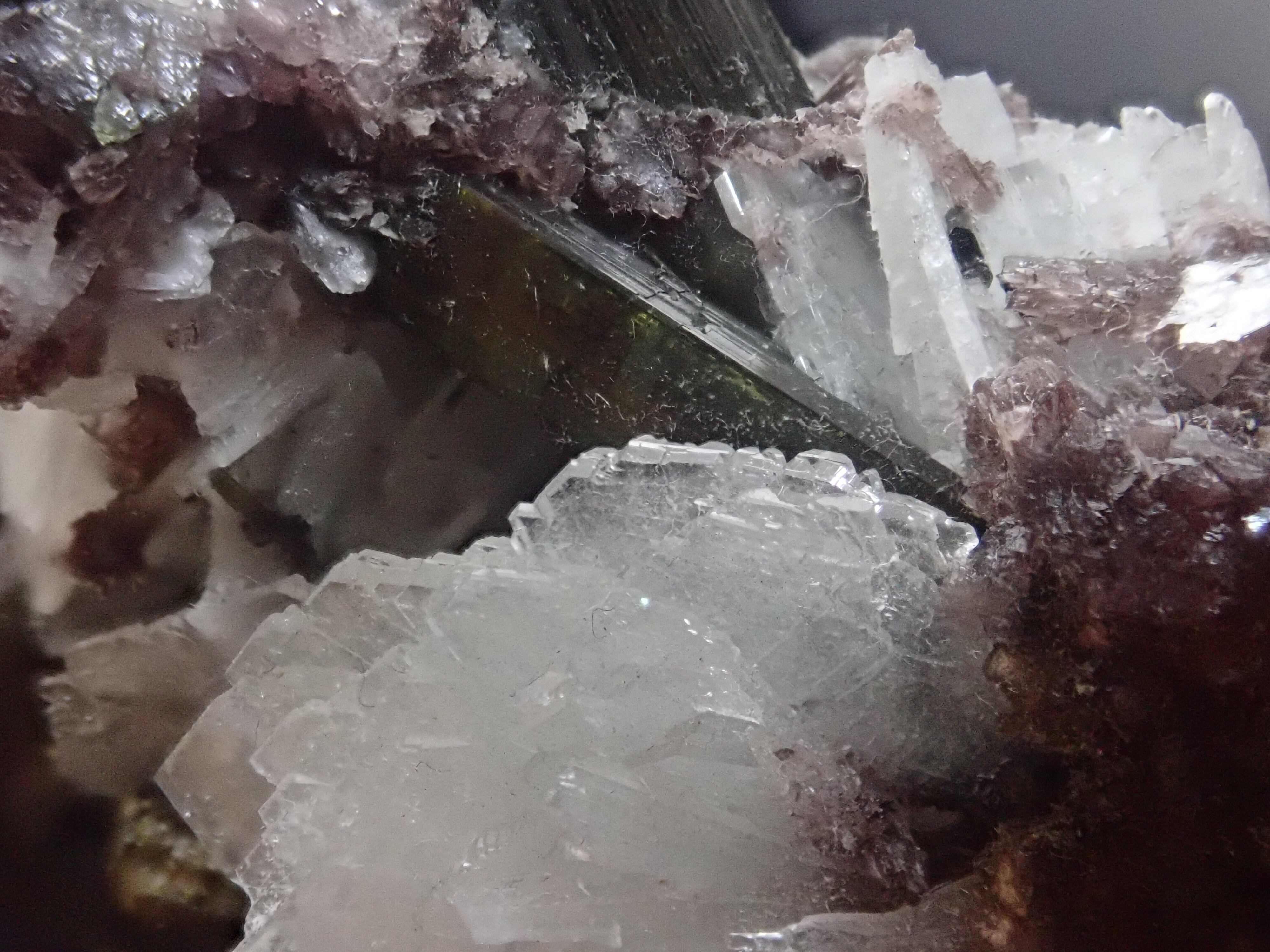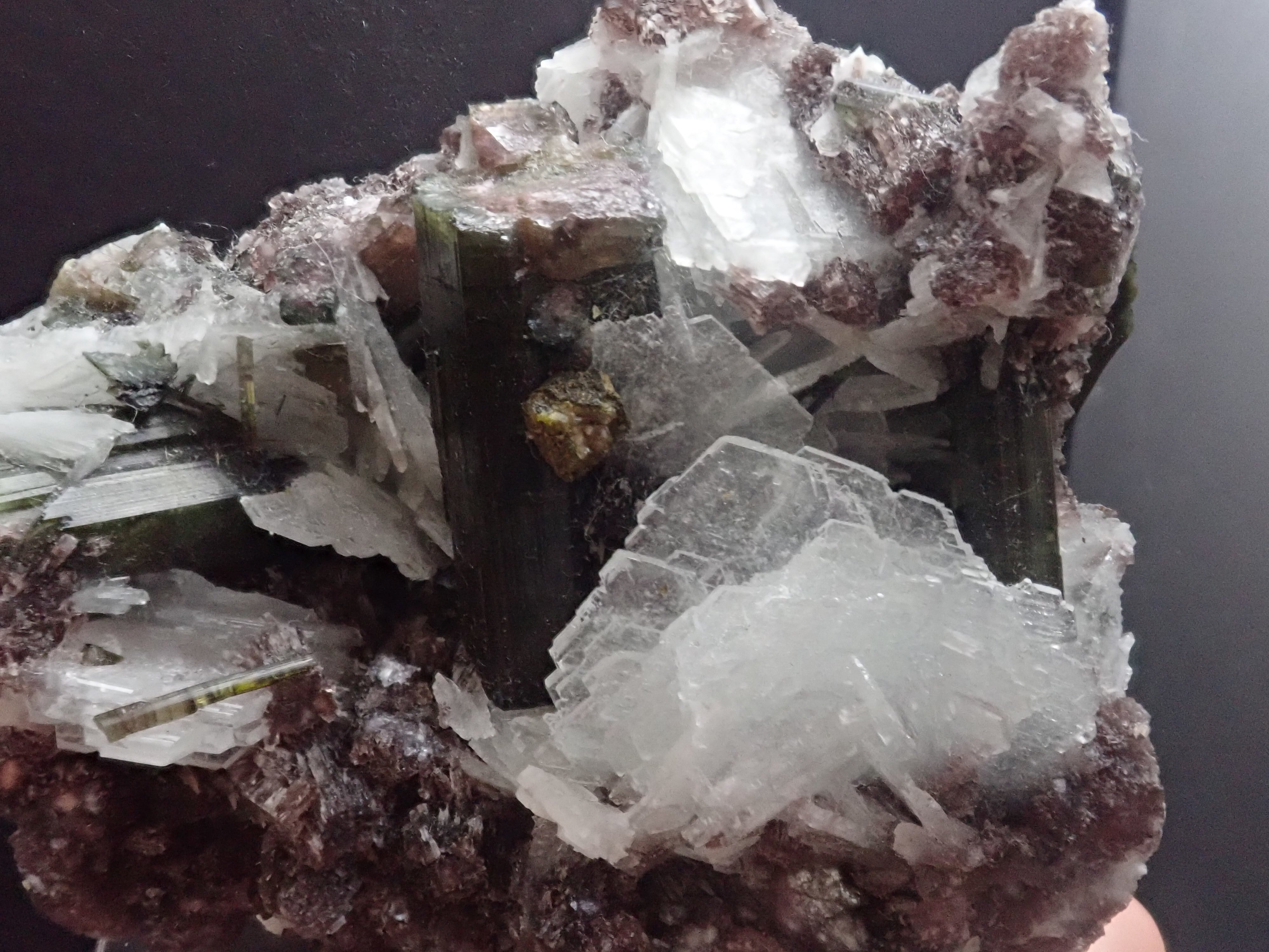 メインの他にもいくつか結晶しており、パープルのレピドライトとホワイトなバライトがトルマリンをより引き立ててくれます。