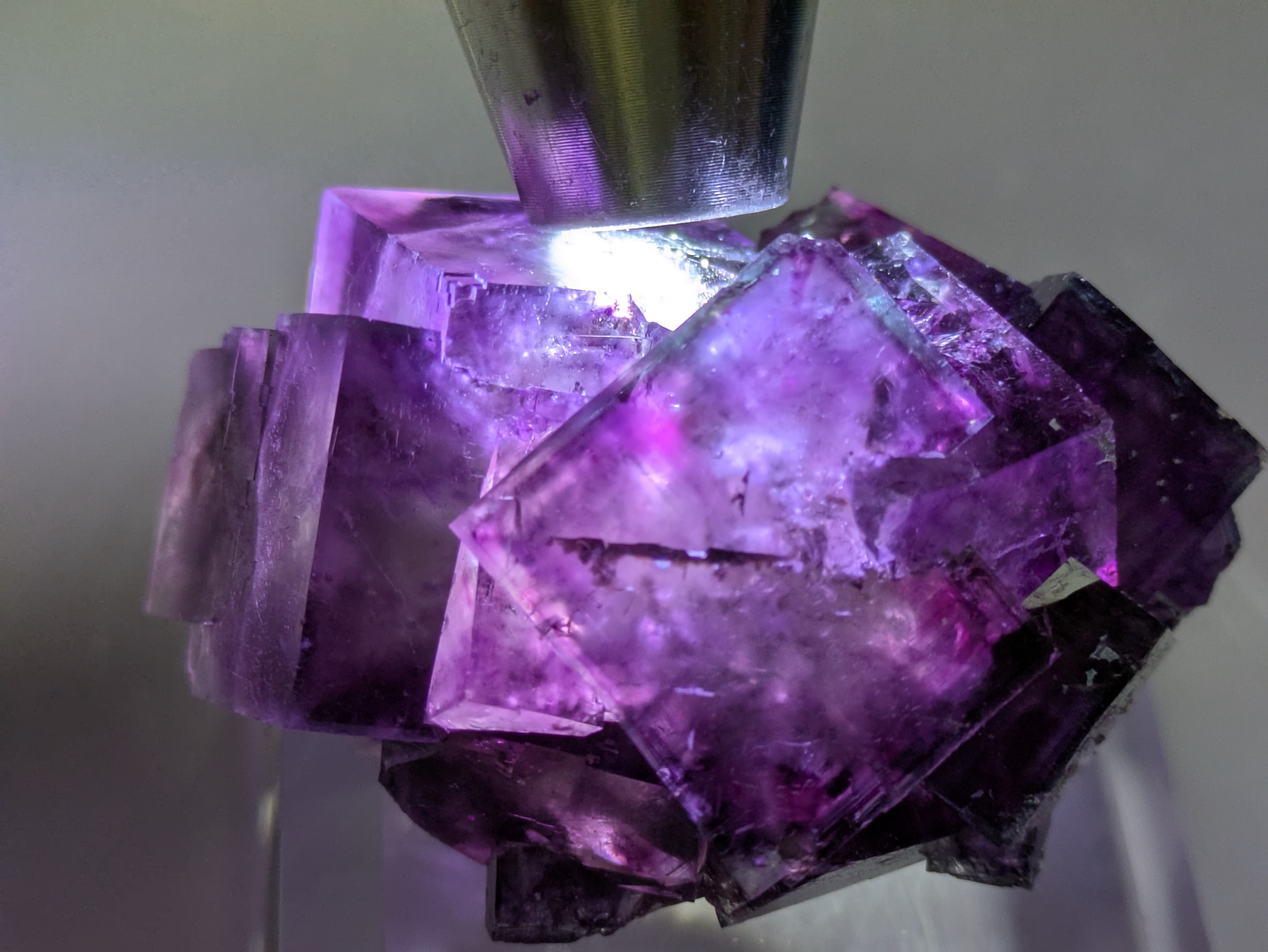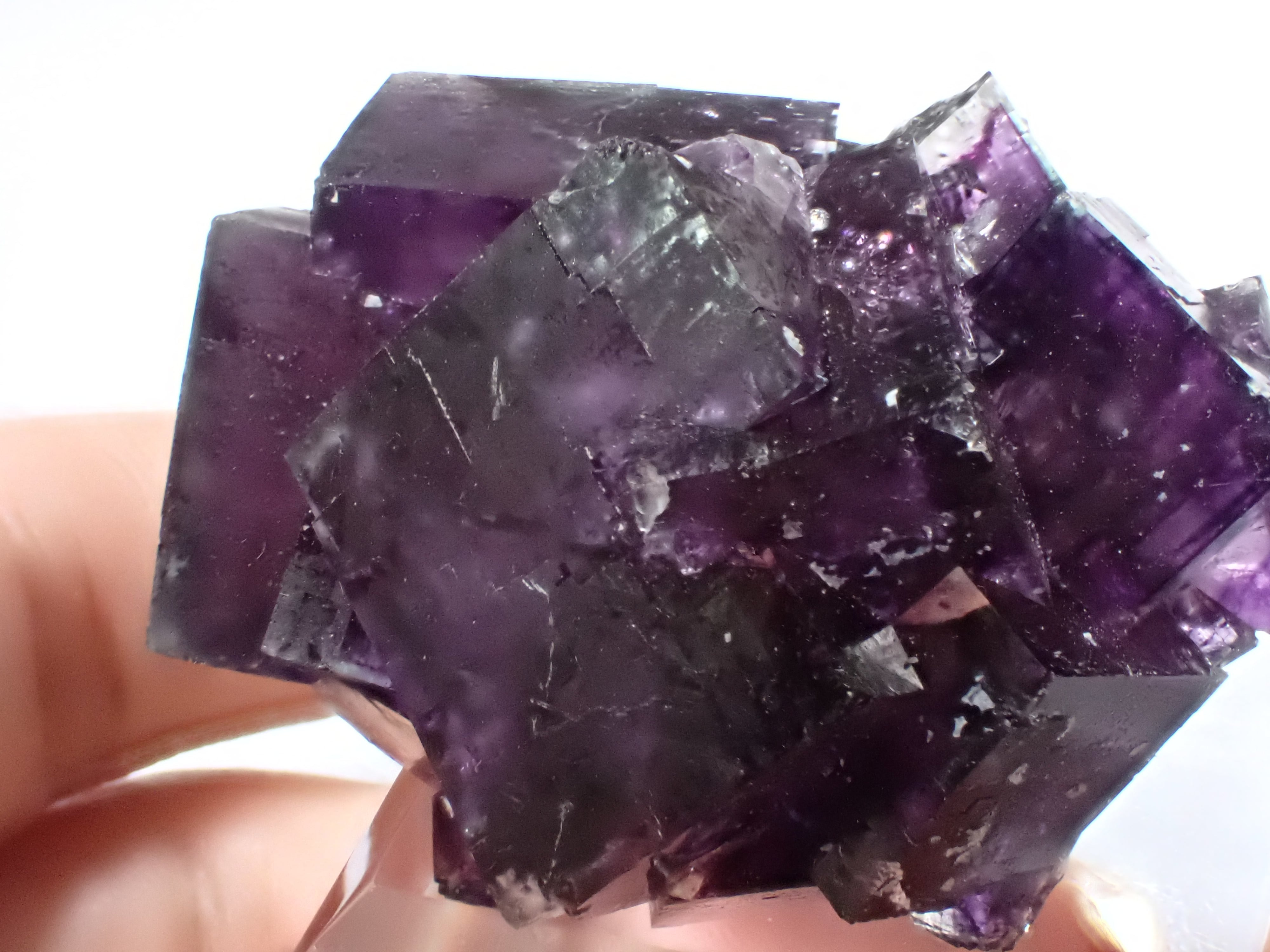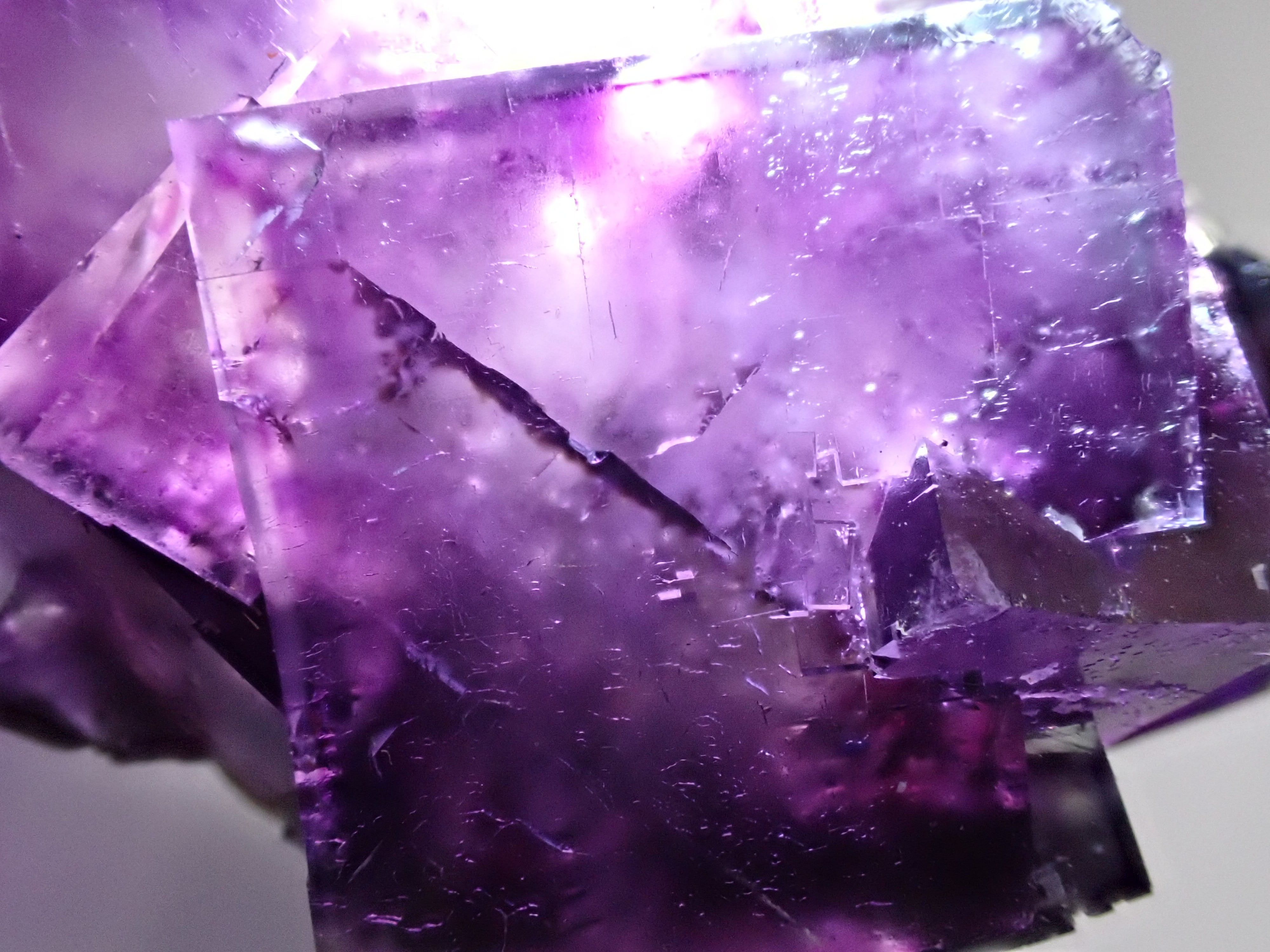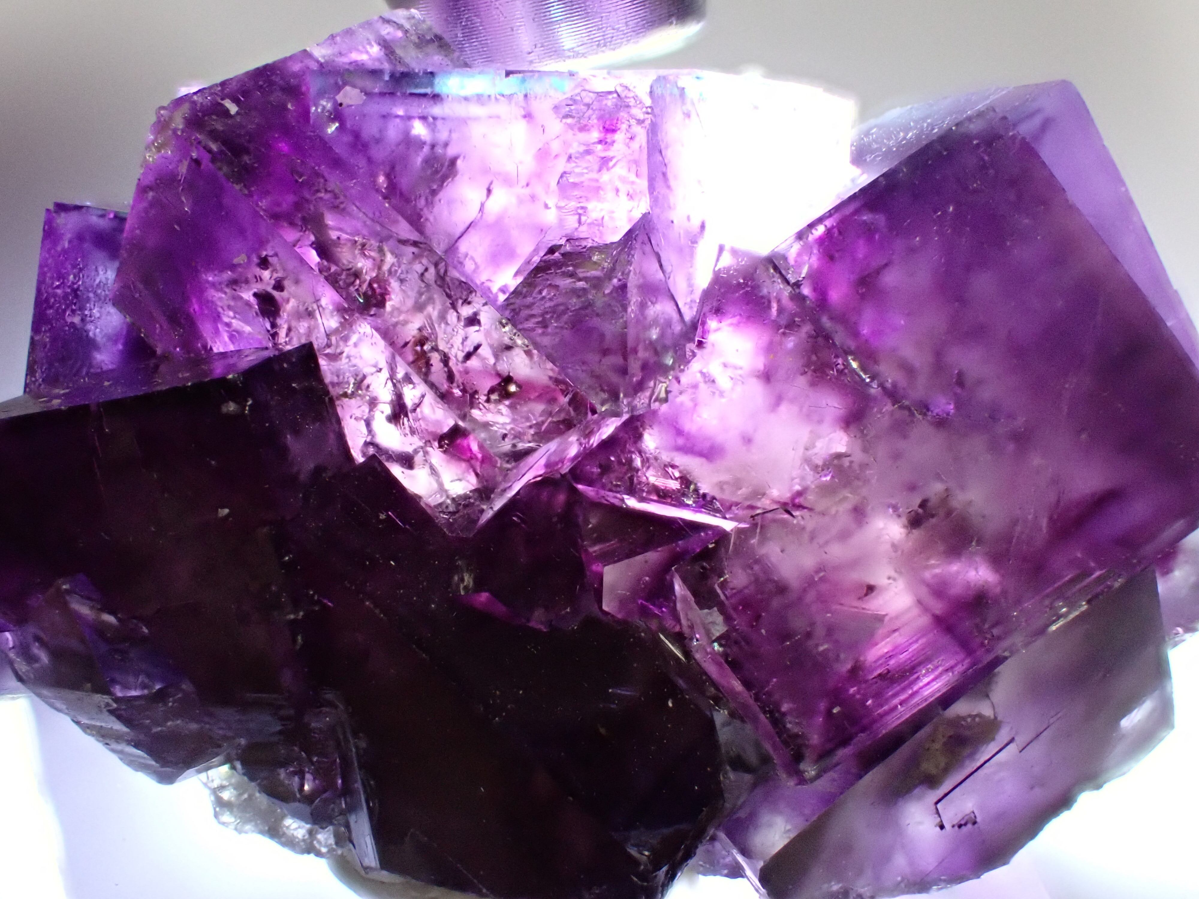 一見濃い紫ですがペンライトで透過すると神秘的な世界が結晶内に広がっています。